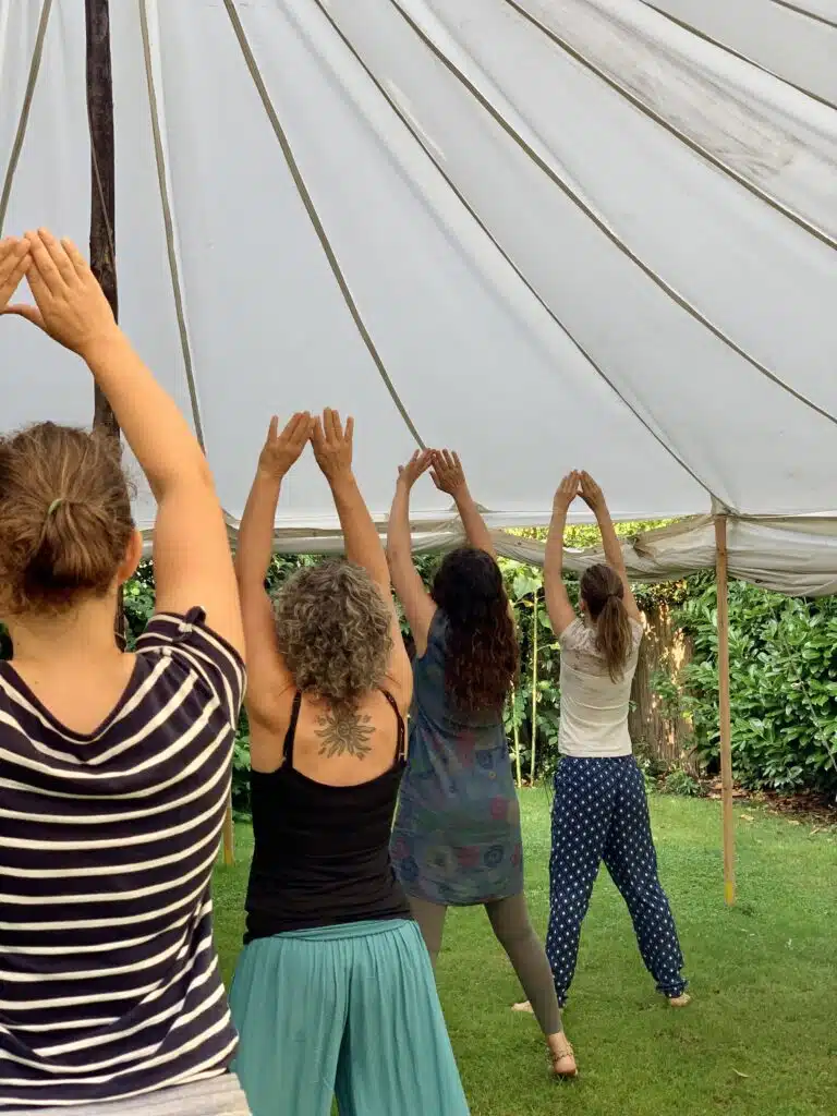 Sie besteht aus einem recht leicht zu erlernenden taichi – ähnlichen Tanz in die Himmelsrichtungen, einer Sitzmeditation mit Visualisation und Gesang und oft auch einem tibetischen Teil.